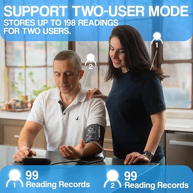Large Easy-to-Read LED Display: Our Blood Pressure Monitor features a large, bright backlit LED screen that clearly shows all measurements on a single screen. The displayed measurements include systolic pressure, diastolic pressure, pulse rate, and user. It is an ideal blood pressure monitor for home use.
